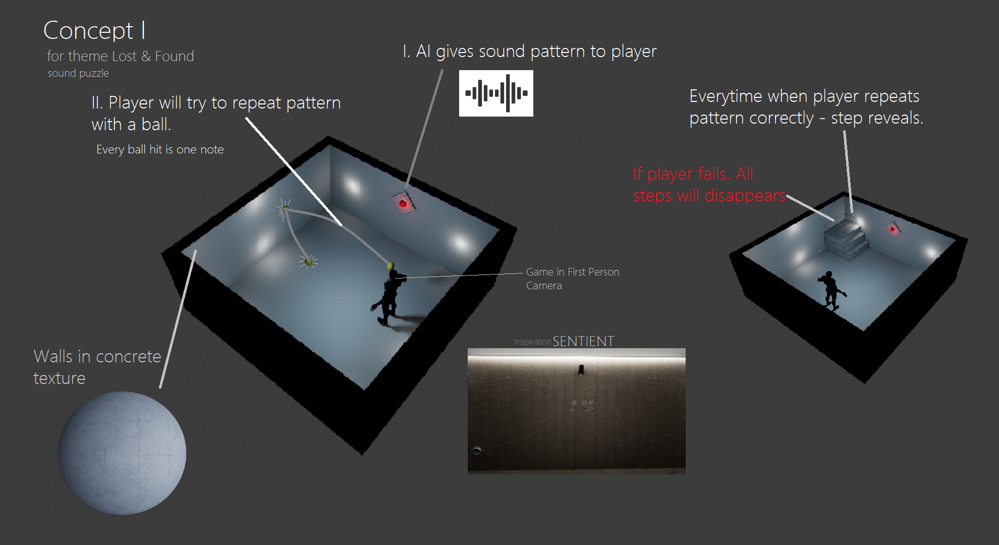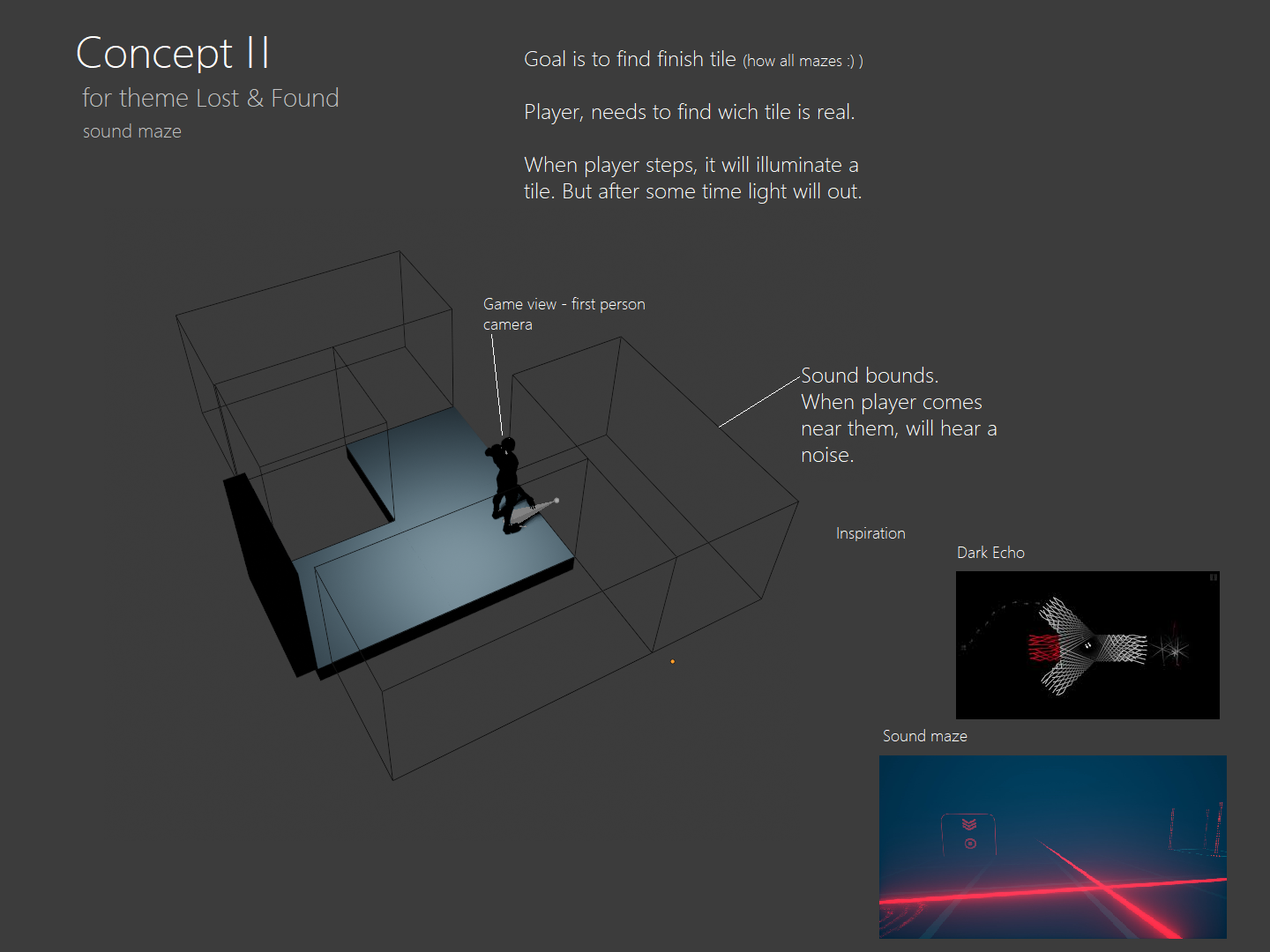 All concepts was done by me. The team decide to create game prototype by concept no. 2. Main idea is – find tiles by using only sound. Tiles reveal just after player is steped on them.